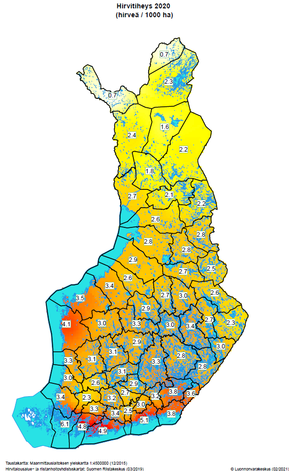 Keskustelu hirvitiheystavoitteista on ollut vilkasta päättyneen kevään aikana. Alueellisten riistaneuvostojen toimintaa on arvosteltu, ettei maanomistajatahojen kantaa oteta tarpeeksi huomioon päätettäessä jäävän kannan tiheyshaarukoista. Riistaneuvoston kokouksessa on jätetty eriäviä mielipiteitä päätöksistä mm. kun tiheyshaarukan ylärajan arvo on pienimmillään ylittynyt 0,1 hirveä tuhannella hehtaarilla esittäjän näkemyksestä. Suuressa osassa maatamme tuo yhden desimaalin korotus tarkoittaa 1-5 hirveä ja keskimäärinkin vain 9,3 hirveä riistanhoitoyhdistyksen alueella. Pienimmillä hirvitalousalueilla kyseinen korotus merkitsee 10 ja keskimääräisesti 51 hirveä. Luonnonvarakeskuksen hirvitalousalueille laatima jäävän kannan koon minimi- ja maksimihaarukka 95%:n luottamusvälillä on maassamme keskimäärin reilut 200 hirveä. Kun hirvieläinten kannanarviointia ei voida suorittaa edes muutaman kymmenen eläimen tarkkuudella hirvitalousalueilla, niin ei jäävän kannan tiheyttäkään voitane vaatia verotussuunnitteluvaiheessa tehtävän alueilla kovin paljon tarkemmin?